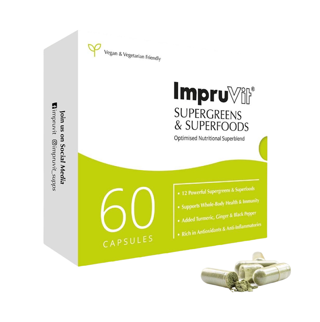 - ALL IN ONE WHOLE BODY SUPPORT from one easy-to-swallow capsule with IMPRUVIT Supergreen & Superfoods. Our proprietary super-blend with Turmeric (Curcumin), Spirulina Ginger Root & Black-Pepper (Bioperine) improves your whole body health & vitality.